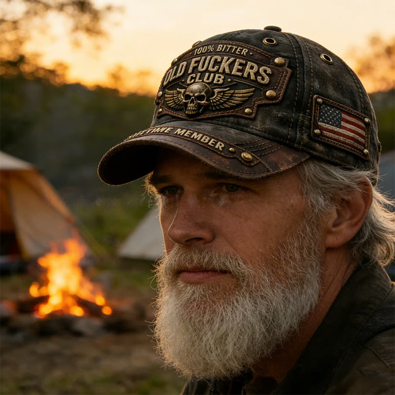 BOLD VINTAGE EMBROIDERY - Flaunt your experience with patches reading "OLD FUCKERS CLUB," "100% BITTER," and "LIFETIME MEMBER." This cap is a badge of honor, celebrating a life well-lived with unapologetic, rugged style.