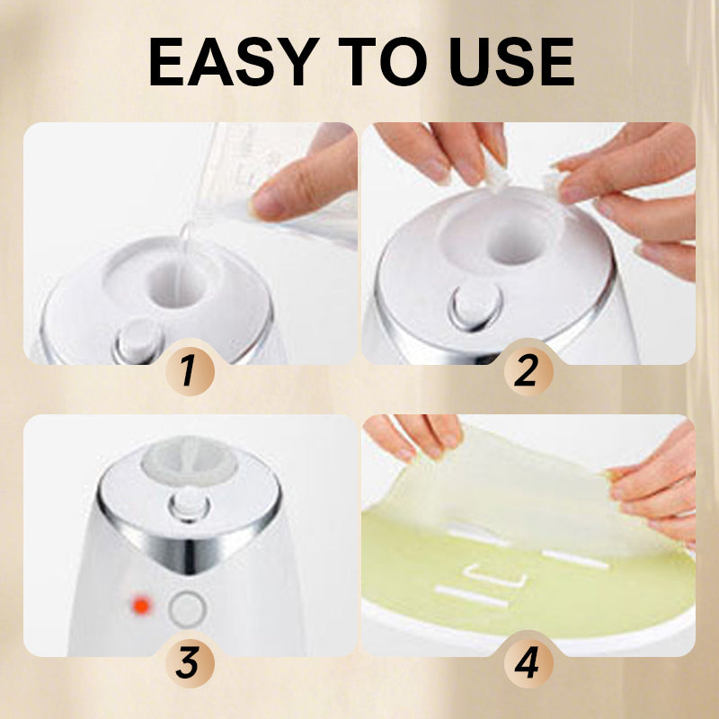 STEP-BY-STEP SIMPLE USE: Just add 60ml of water, 20ml of juice, and a collagen capsule, press the button, wait 5 minutes, pour onto the mask plate, and cool. In 10 steps, your mask is ready—fast, safe, and budget-friendly.