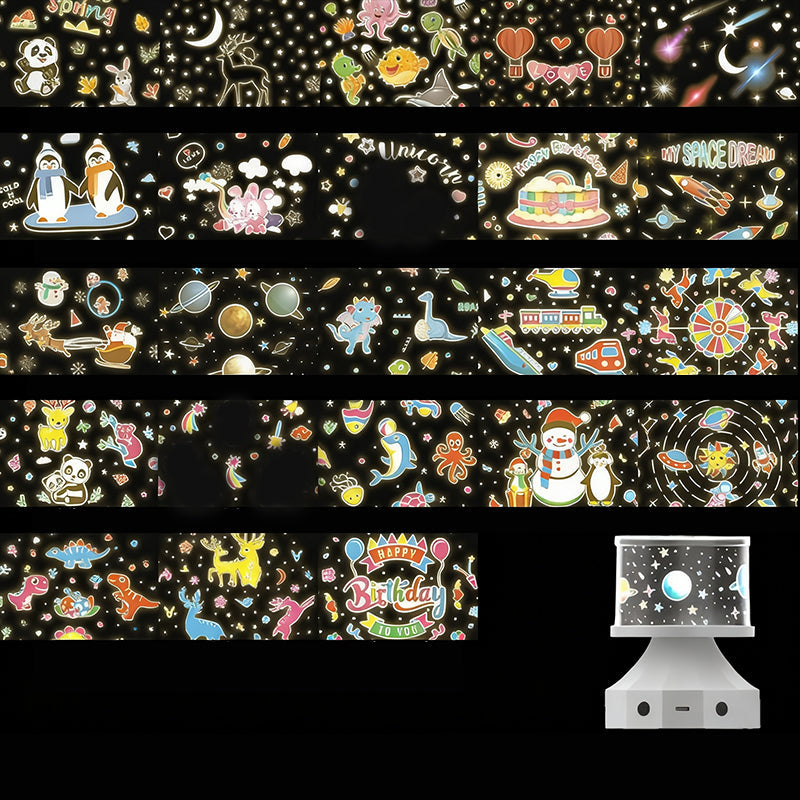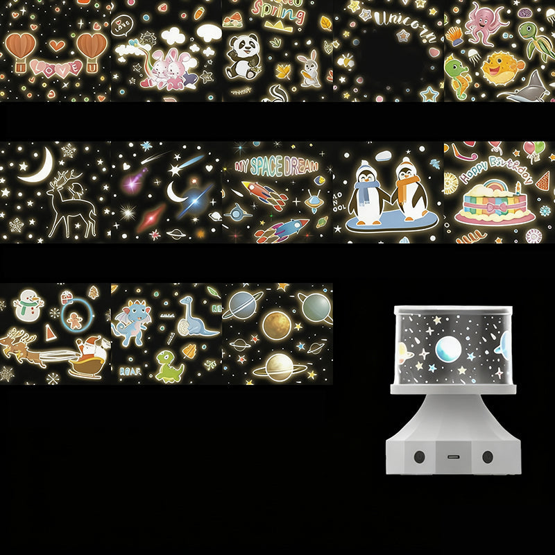 MULTIPLE THEME PROJECTIONS - Create a new world every night with up to 23 interchangeable film sets. Transform any room into a magical space, from a starry universe to a vibrant animal kingdom.