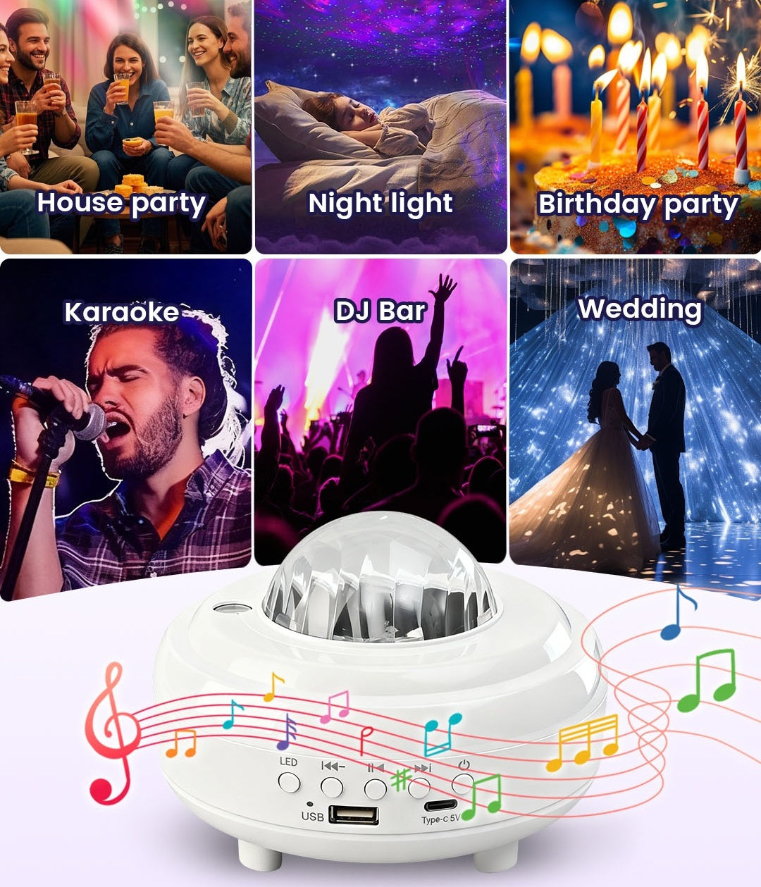 The voice-activated mode synchronizes the lights to the beat of the music. Soothing music relaxes and helps you fall asleep.